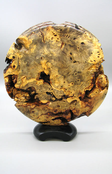 Buckeye burl is a very unique west coast burl which forms on the root system of the tree. The random color patterns that naturally occur along with the sculptural edges make this one of the most interesting burls that I work with. All of the circular vases listed here come with a glass vial to be used with live flowers. All other flower vases containing either a glass vial or metal cup will hold water. Flowers not included.