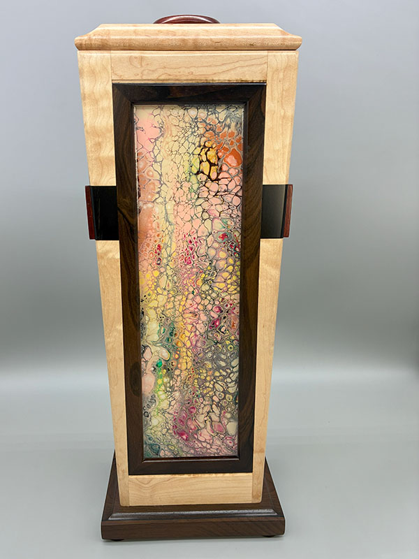 5" by 21" tall, ziracote, bloodwood, acrylic painted panels on 2 sides with a 1 3/4" diameter by 7 1/2" glass vial included