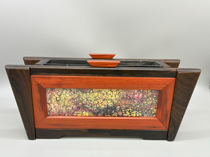 15" by 4" by 7" tall. Curly maple, ziracote, bloodwood, acrylic painted panels on two sides with two rectangular frogs included.