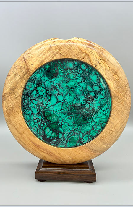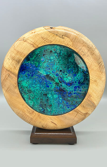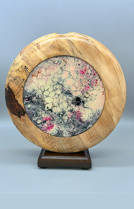 12" by 14" circular vase, spalted curly maple, ziracote, acrylic paint, glass vial included.
