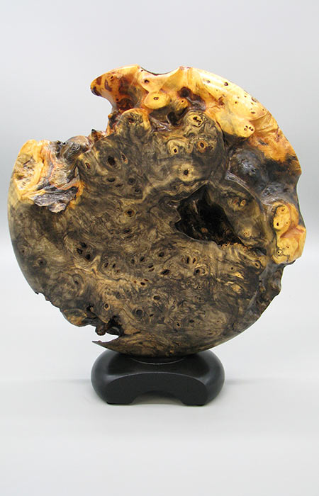 12" by 13" circular vase with glass vial, buckeye burl with black dyed base