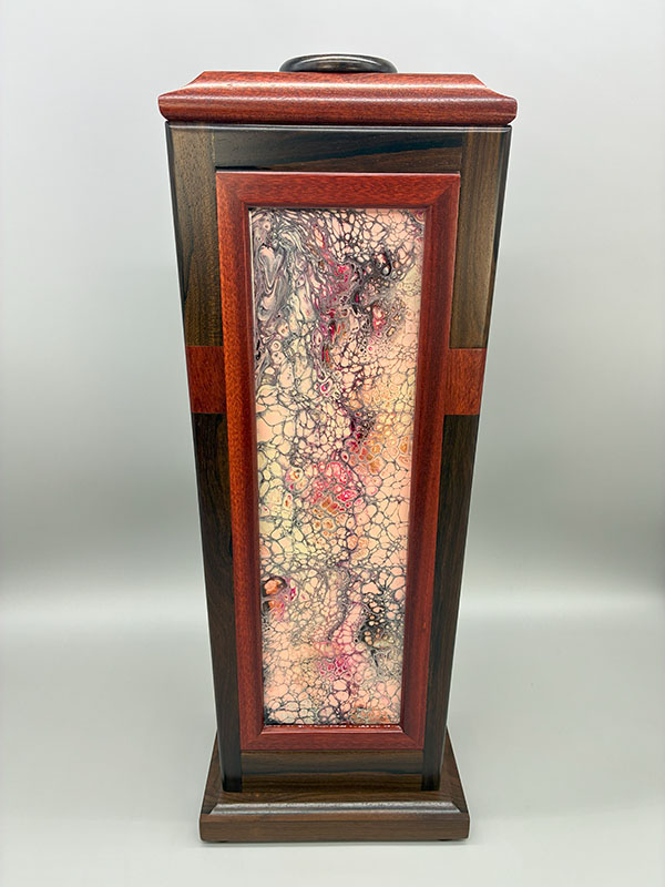 5" by 21" tall, ziracote, bloodwood, acrylic painted panels on 2 sides with a 1 3/4" diameter by 7 1/2" glass vial included