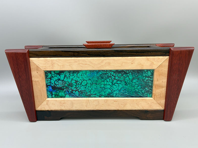 15" by 4" by 7" tall. Curly maple, ziracote, bloodwood, acrylic painted panels on two sides with two rectangular frogs included.